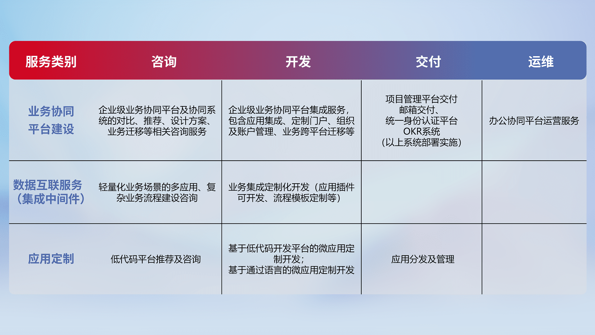 针对钉钉、、、、企微、、、、IDaas等平台级产品提供产品的规划、、方案、、、交付、、、定制化开发等服务,,,,实现如统一协同办公、、、、智能客户服务、、、、混合会议管理、、智能数据查询、、等业务场景,,实现数字化转型。。。