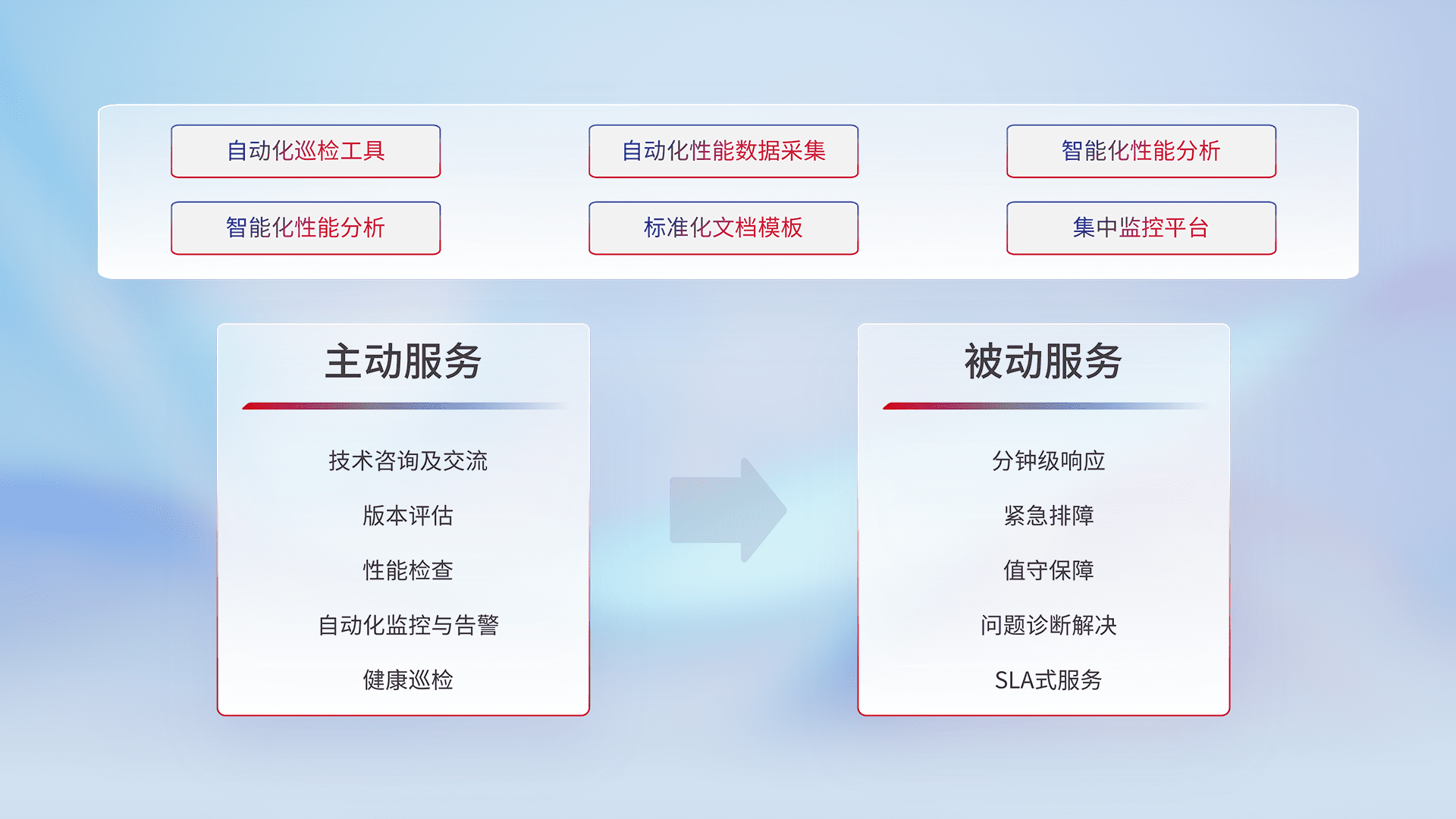 智能化工具和标准化文档,,,保障服务质量,,,提供主动服务(包含技术咨询、、版本评估、、、性能检查、、自动化监控与告警、、、、健康巡检)和被动服务包含(分钟级响应、、紧急排障、、、值守保障、、问题诊断解决、、、SLA服务)。。。