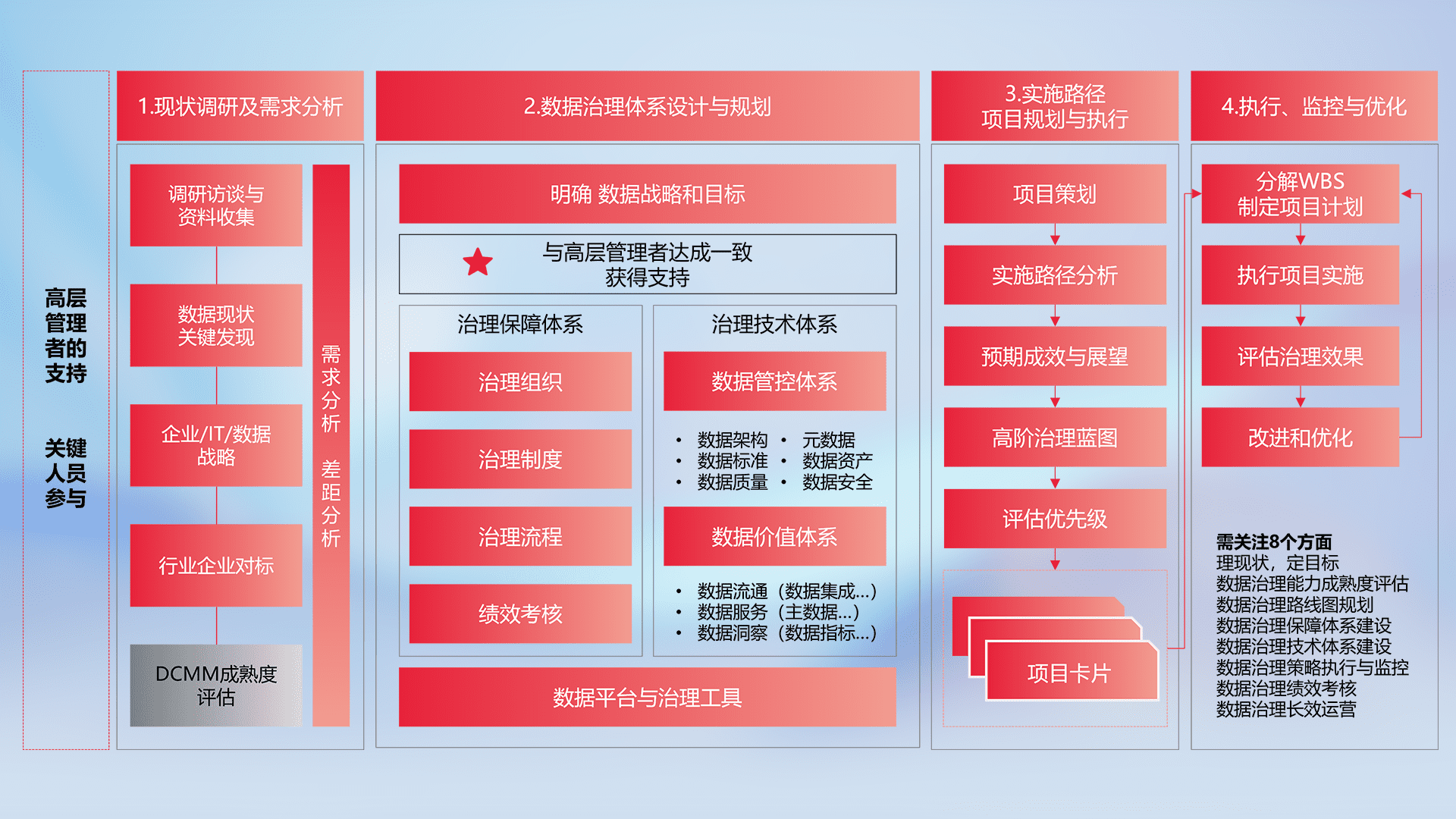 制定并执行统一的数据标准,,规范数据定义和格式,,,,消除冗余和不一致性,,,,实现跨部门和跨系统的数据一致性,,,为企业提供标准化的数据基础。。